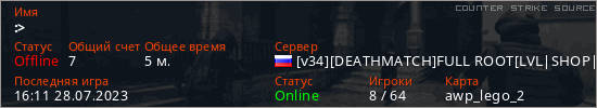 Играет на Counter Strike Source сервере. Страна: РоссияПервый раз замечен 05:18 28.07.2023