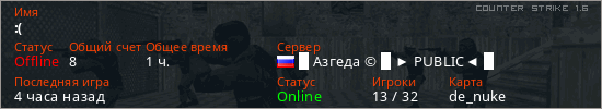 Играет на Counter Strike 1.6 сервере. Страна: РоссияПервый раз замечен 22:03 16.04.2026