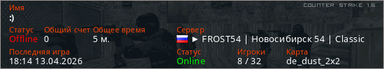 Играет на Counter Strike 1.6 сервере. Страна: РоссияПервый раз замечен 18:04 13.04.2026