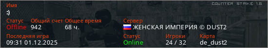 Играет на Counter Strike 1.6 сервере. Страна: РоссияПервый раз замечен 15:23 22.08.2021