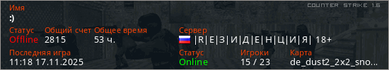Играет на Counter Strike 1.6 сервере. Страна: РоссияПервый раз замечен 22:11 01.03.2019