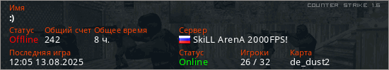 Последний раз был в сети 12:05 13.08.2025 Игрок с таким ником замечен на 68 серверах