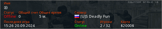 Играет на Counter Strike 1.6 сервере. Страна: РоссияПервый раз замечен 15:24 20.09.2024
