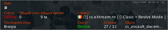Играет на Counter Strike 1.6 сервере. Страна: РумынияПервый раз замечен 02:14 09.05.2025
