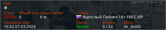 Играет на Counter Strike 1.6 сервере. Страна: РоссияПервый раз замечен 10:07 07.03.2026