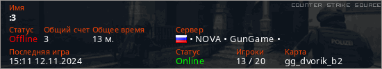 Играет на Counter Strike Source сервере. Страна: РоссияПервый раз замечен 12:19 23.10.2024