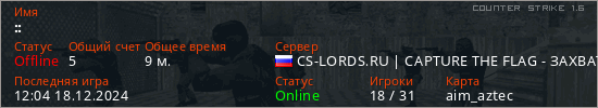 Играет на Counter Strike 1.6 сервере. Страна: РоссияПервый раз замечен 16:20 27.05.2024