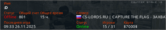 Играет на Counter Strike 1.6 сервере. Страна: РоссияПервый раз замечен 16:58 04.11.2020