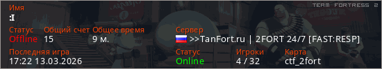 Играет на Team Fortress 2 сервере. Страна: РоссияПервый раз замечен 17:09 13.03.2026