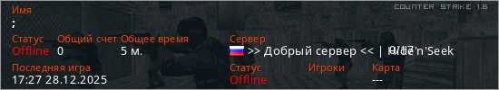 Играет на Counter Strike 1.6 сервере. Страна: РоссияПервый раз замечен 16:45 28.12.2025