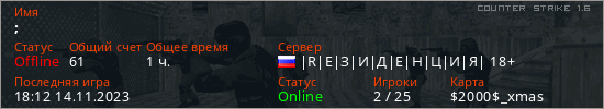 Играет на Counter Strike 1.6 сервере. Страна: РоссияПервый раз замечен 22:45 02.12.2021