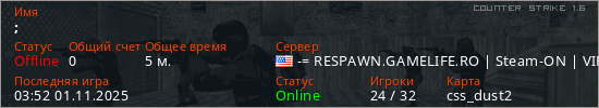 Играет на Counter Strike 1.6 сервере. Страна: СШАПервый раз замечен 03:50 01.11.2025