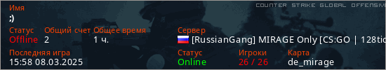 Играет на Counter Strike Global Offensive сервере. Страна: РоссияПервый раз замечен 19:47 14.01.2024