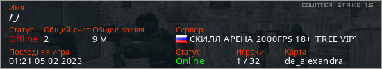 Играет на Counter Strike 1.6 сервере. Страна: РоссияПервый раз замечен 01:15 05.02.2023