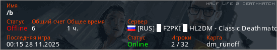 Играет на Half Life 2 DeathMatch сервере. Страна: РоссияПервый раз замечен 22:05 16.11.2025