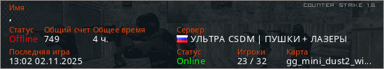 Играет на Counter Strike 1.6 сервере. Страна: РоссияПервый раз замечен 12:24 14.02.2024