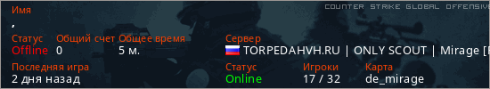 Играет на Counter Strike Global Offensive сервере. Страна: РоссияПервый раз замечен 19:33 04.03.2026