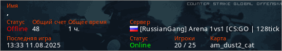 Играет на Counter Strike Global Offensive сервере. Страна: РоссияПервый раз замечен 20:51 07.10.2023
