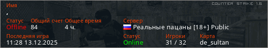 Играет на Counter Strike 1.6 сервере. Страна: РоссияПервый раз замечен 17:23 25.01.2023