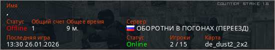 Играет на Counter Strike 1.6 сервере. Страна: РоссияПервый раз замечен 09:00 26.01.2026