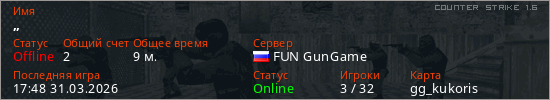 Играет на Counter Strike 1.6 сервере. Страна: РоссияПервый раз замечен 17:22 31.03.2026
