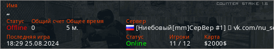 Играет на Counter Strike 1.6 сервере. Страна: РоссияПервый раз замечен 18:06 25.08.2024