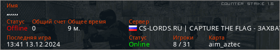 Играет на Counter Strike 1.6 сервере. Страна: РоссияПервый раз замечен 10:01 12.12.2024