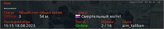 Играет на Counter Strike 1.6 сервере. Страна: РоссияПервый раз замечен 13:38 18.08.2023