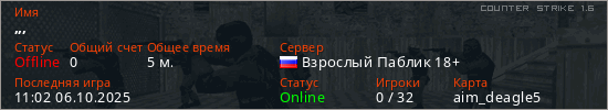 Играет на Counter Strike 1.6 сервере. Страна: РоссияПервый раз замечен 11:00 06.10.2025