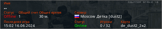 Играет на Counter Strike 1.6 сервере. Страна: РоссияПервый раз замечен 17:05 03.06.2024