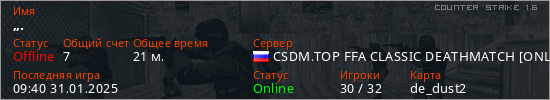 Играет на Counter Strike 1.6 сервере. Страна: РоссияПервый раз замечен 21:53 13.01.2025