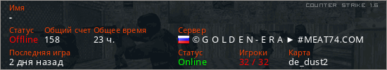 Играет на Counter Strike 1.6 сервере. Страна: РоссияПервый раз замечен 17:23 20.01.2023
