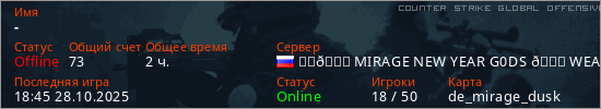 Играет на Counter Strike Global Offensive сервере. Страна: РоссияПервый раз замечен 20:29 02.05.2024