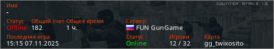 Играет на Counter Strike 1.6 сервере. Страна: РоссияПервый раз замечен 13:10 21.02.2023