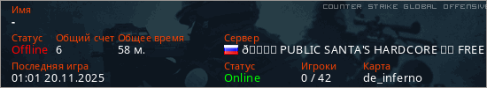 Играет на Counter Strike Global Offensive сервере. Страна: РоссияПервый раз замечен 20:33 25.01.2025