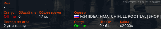 Играет на Counter Strike Source сервере. Страна: РоссияПервый раз замечен 12:00 28.04.2023