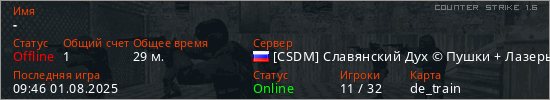 Играет на Counter Strike 1.6 сервере. Страна: РоссияПервый раз замечен 12:09 26.05.2024