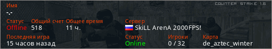Играет на Counter Strike 1.6 сервере. Страна: РоссияПервый раз замечен 12:29 11.08.2022