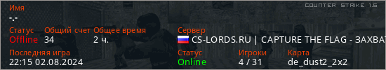 Последний раз был в сети 22:15 02.08.2024 Игрок с таким ником замечен на 31 сервере