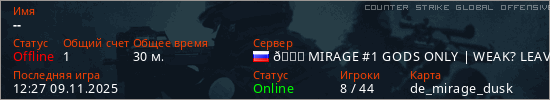 Играет на Counter Strike Global Offensive сервере. Страна: РоссияПервый раз замечен 19:56 29.10.2024