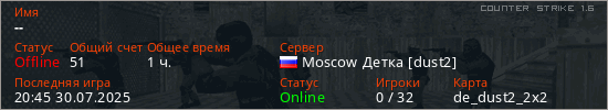 Последний раз был в сети 20:45 30.07.2025 Игрок с таким ником замечен на 46 серверах