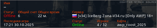 Играет на Counter Strike Source сервере. Страна: РоссияПервый раз замечен 16:27 19.10.2025