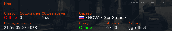 Играет на Counter Strike Source сервере. Страна: РоссияПервый раз замечен 21:51 05.07.2023