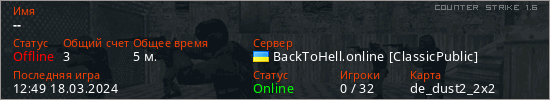 Играет на Counter Strike 1.6 сервере. Страна: УкраинаПервый раз замечен 11:32 18.03.2024