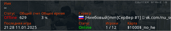 Играет на Counter Strike 1.6 сервере. Страна: РоссияПервый раз замечен 11:28 11.01.2022