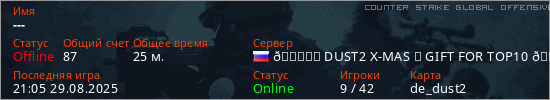 Играет на Counter Strike Global Offensive сервере. Страна: РоссияПервый раз замечен 15:25 06.02.2025