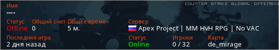 Играет на Counter Strike Global Offensive сервере. Страна: РоссияПервый раз замечен 17:51 23.04.2026