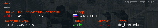 Играет на Counter Strike 1.6 сервере. Страна: РоссияПервый раз замечен 08:07 19.01.2023