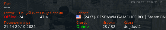 Играет на Counter Strike 1.6 сервере. Страна: СШАПервый раз замечен 15:59 26.10.2025
