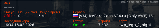 Играет на Counter Strike Source сервере. Страна: РоссияПервый раз замечен 16:01 18.02.2026